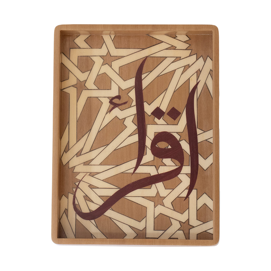 - "Iqra" Marquetry light wood tray with Arabic design, Price: 2610 QAR