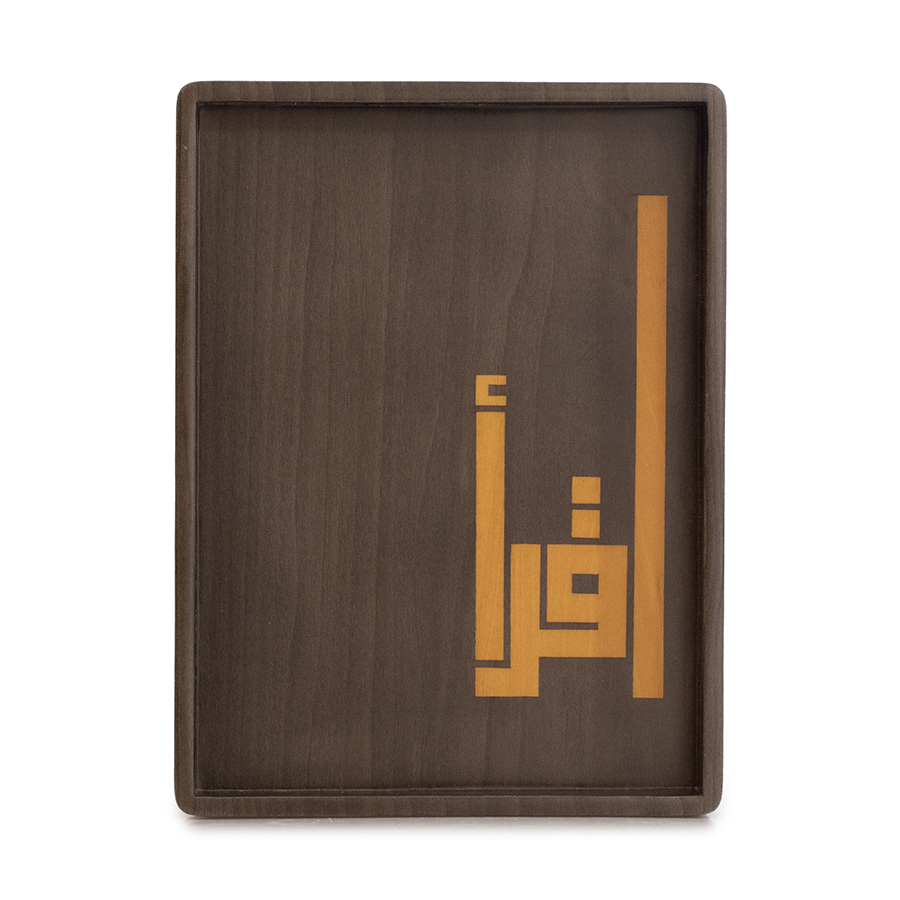 - "Iqra" Marquetry dark wood tray with Arabic design, Price: 2610 QAR